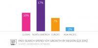 North America, according to ADI, is in the lead for growth in search marketing spend, for which Roberts attributed to the relative strength of the U.S. economy. “It is likely that economic differences are the key driver for regional trends, ” he told CMO.com. Indeed, paid search spend increased 17% YoY, with click-through rates in North America on the rise and cost-per-click (CPC) flat for the same period.